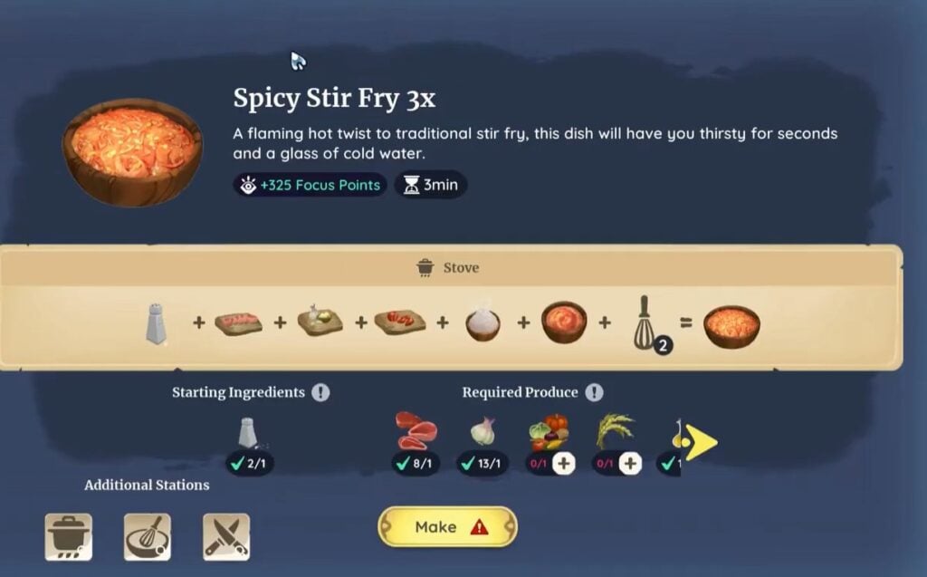 Once you have the Spicy Stir Fry recipe, you will be able to make it using your cooking appliances. As each recipe requires certain cooking appliances and ingredients, it is the same for the Spicy Stir Fry. You need 2 Standard Stoves, 1 Mixing Station, and 1 Prep Station to make the Spicy Stir Fry using the following ingredients.
