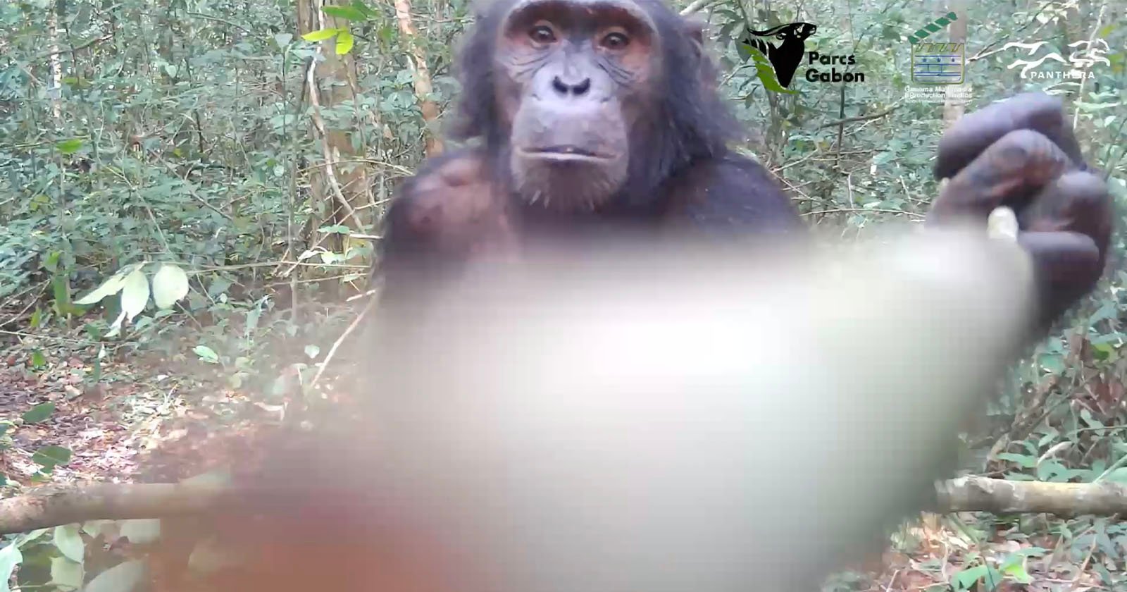 A chimpanzee investigated a remote camera by poking it with a stick, in a rare video of an ape using a tool in the wild.