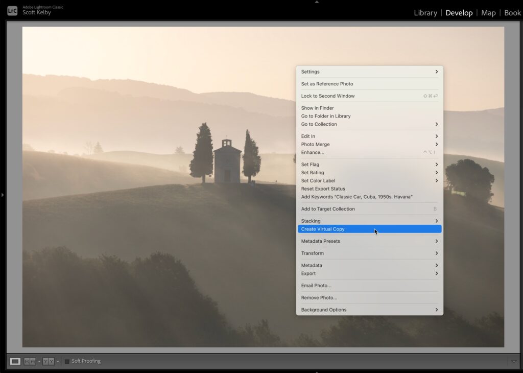 First, if you’re not familiar with Virtual Copies, here’s a quick glimpse at what they are, and we’ll use Photoshop as an example. If you were to open a 50-megapixel image in Photoshop and you want to compare that image with another copy of it, you would have to duplicate that image. That means you now have another 50-megabyte photo on your computer. You’ve literally doubled your file size just to see a second version of your image. In Lightroom, when you create a Virtual copy, it doesn’t duplicate the file. It essentially duplicates just the thumbnail, so it barely takes up any space at all. SoK you can make as many copies as you like, so you can compare them without really taking up any extra space. It’s why they’re called “virtual copies” — it doesn’t make a real copy. This will make more sense in just a moment. Follow along below: