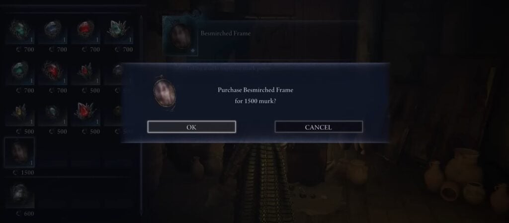 After unlocking Duchess, go to the Small Jar Bazaar and scroll down to find the Besmirched Frame relic. If you have completed the initial expedition, you shall have enough Murk to purchase the relic. Upon purchasing the Relic, a phantom will appear in the hub area. You can find the phantom in a room looking at a picture on the wall. Interact with the phantom, and agree to touch the phantom.