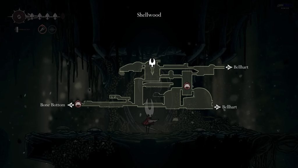 From the bench symbol, climb up by pogoing off the white flowers. As you reach the top, go to the room on the right. Continue ahead, and you will come across an elevator. Take the elevator down to unlock the shortcut from the bench. After that, head back up with the elevator and continue to the room on the right. From here, go to the left side, as you won’t be able to climb the bell on the right. Reach the next room on the left. It will initiate the boss fight with Sister Splinter.