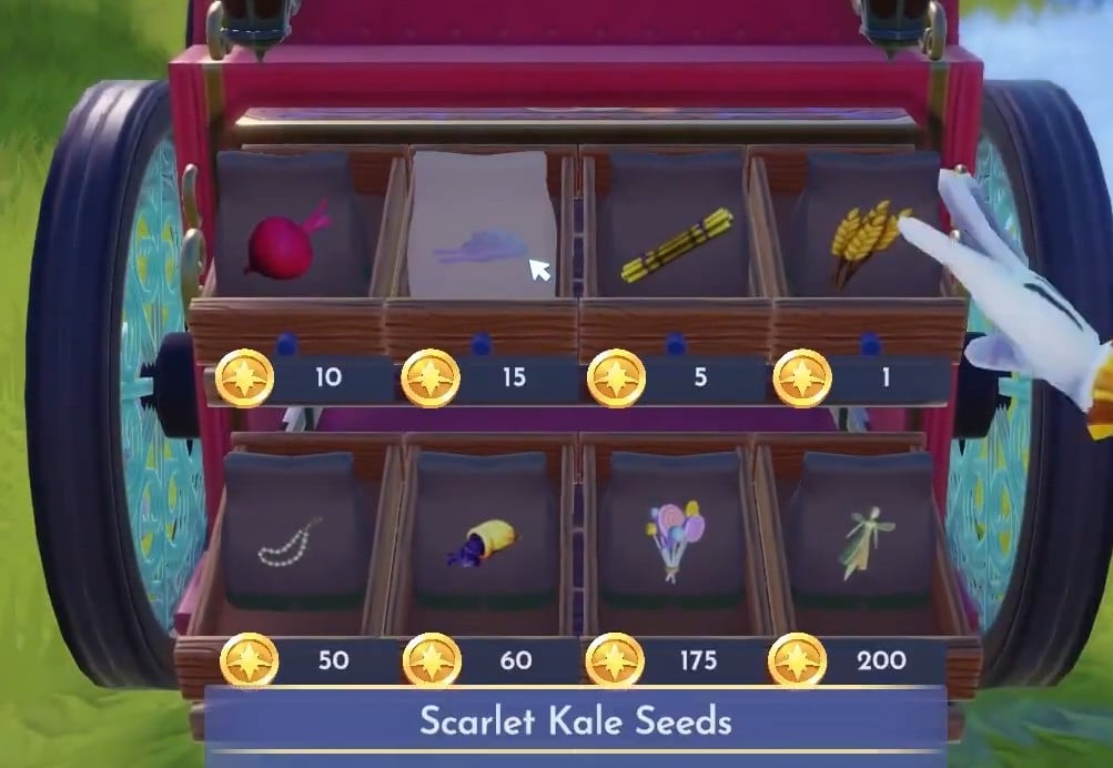 Scarlet Kale is one of the first two items Goofy sells before upgrading the stall. When unlocking Scarlet Kale Seeds at Goofy’s Caravan, they cost 15 Star Coins each, and it takes 10 minutes for each seed to mature into a Scarlet Kale. Using the Elixir on the Watering Can will instantly grow the Scarlet Kale.