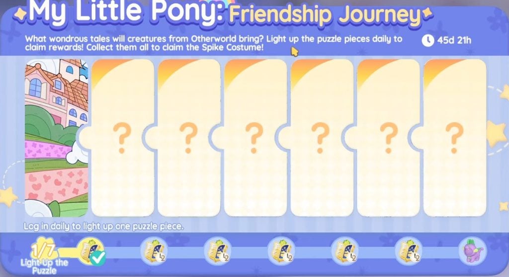 My Little Pony: Friendship Journey is a pre-event that will last for 45 days. Unlike bigger events, this pre-event is similar to the daily log-in event. It is a log-in and claim reward-type of event, where you have to check up on the MLP event page to reveal a new piece of the puzzle for 7 days. In return, you will get to claim 2x Exhibition Passes (Time-Limited) for the first 6 puzzle pieces, and on the final puzzle piece, you will unlock the Spike Costume for pets.