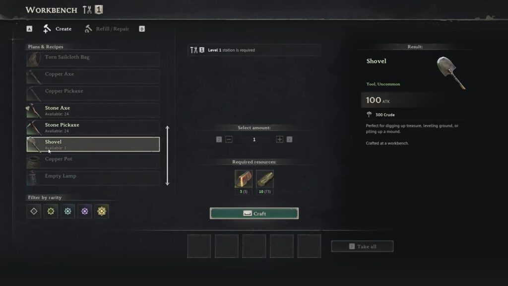 However, what the game does not tell you here is that you need a Shovel (tool) to dig up the treasure chest. You cannot get to the chest without the shovel. Fortunately, you can craft the Shovel at the workbench (Level 1) using 3x Copper Ingot and 10x Wood.